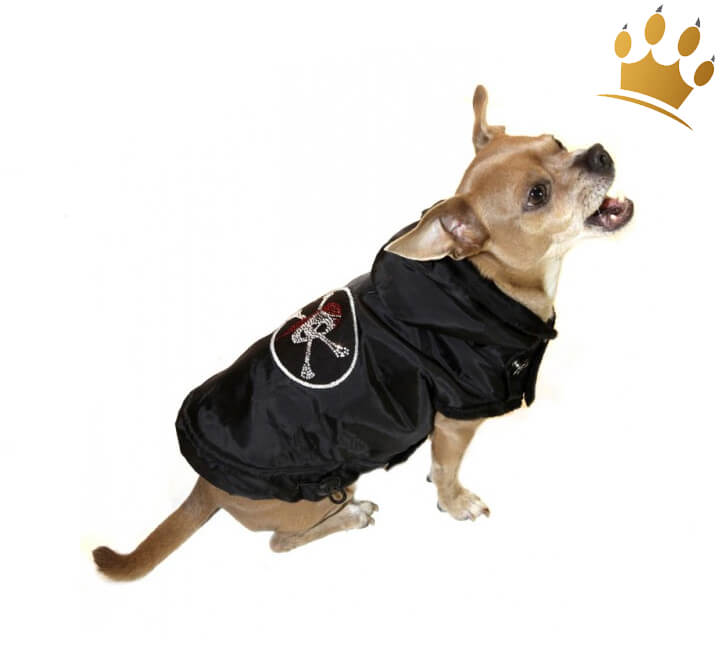 Innen ist der Hundemantel mit sehr weichem, schwarzen Kuschelstoff gefüttert. Die cool wirkende Applikation in Form eines Piratenkopfes auf der Rückenpartie, runden den feschen Look des Hundemantels ab.