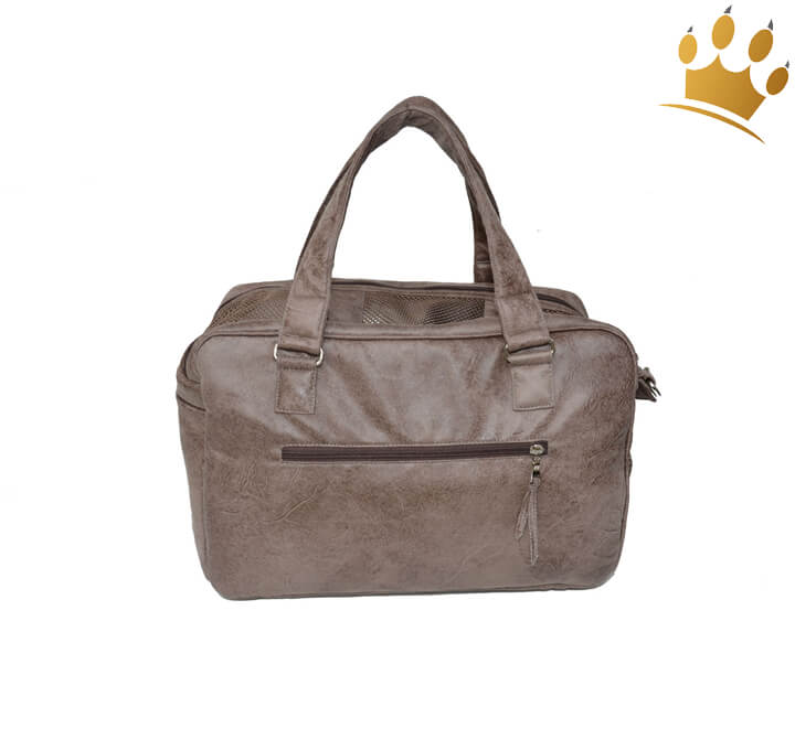 Die Hundetasche wurde Außen aus einem hochwertigen beigefarbenen Interieurstoff in einer edlen Vintage-Optik gefertigt. Innen wurde ein sehr weicher ultrasoften cremefarbener Webpelz gewählt.