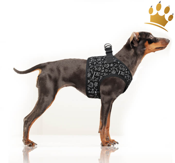 Das Step In Hundegeschirr ist ein Geschirr ideal für den Sommer ... es ist aus einem mit vielen kleinen rockigen Elementen bedruckten Neoprenstoff gefertigt.